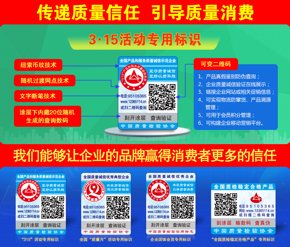 中國(guó)質(zhì)量檢驗(yàn)協(xié)會(huì)防偽溯源和物流管理服務(wù)系統(tǒng)(簡(jiǎn)稱中檢聯(lián)合質(zhì)量誠(chéng)信驗(yàn)證系統(tǒng))是以物聯(lián)網(wǎng)、大數(shù)據(jù)、云計(jì)算、區(qū)塊鏈和移動(dòng)互聯(lián)網(wǎng)技術(shù)為基礎(chǔ)建設(shè)的全過程防偽溯源與質(zhì)量誠(chéng)信驗(yàn)證服務(wù)平臺(tái),依托廣大技術(shù)機(jī)構(gòu)的技術(shù)支撐,應(yīng)用二維碼為載體,使用一物一碼防偽技術(shù),同時(shí)采用文字、圖片和視頻等多媒體方式,完整記錄產(chǎn)品的原料來源、生產(chǎn)加工、倉(cāng)儲(chǔ)物流和市場(chǎng)銷售等詳細(xì)信息,融合實(shí)現(xiàn)產(chǎn)品質(zhì)量來源可查、去向可追、責(zé)任可究的全過程追溯,切實(shí)方便企業(yè)履行質(zhì)量安全主體責(zé)任并用科技、智能化、信息化的手段去加強(qiáng)質(zhì)量安全風(fēng)險(xiǎn)控制,維護(hù)消費(fèi)者合法權(quán)益,讓人民群眾買得放心、吃得放心、用得放心...