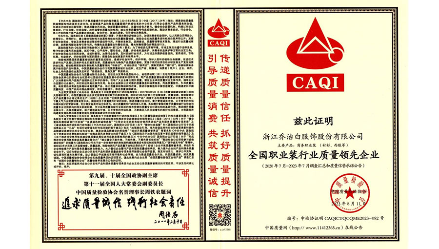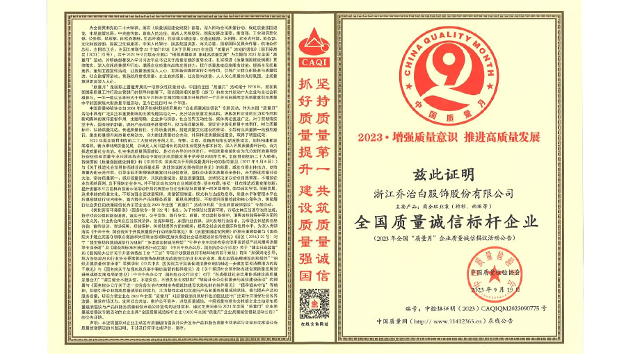 喬治白先后榮獲中國(guó)名牌產(chǎn)品、中國(guó)職業(yè)裝十大領(lǐng)軍企業(yè)、全國(guó)守合同重信用單位、國(guó)家級(jí)綠色工廠、浙江省智能工廠等榮譽(yù)稱號(hào)。作為全國(guó)標(biāo)準(zhǔn)化工作先進(jìn)單位,喬治白積極參與標(biāo)準(zhǔn)化工作,先后參與《職業(yè)裝檢驗(yàn)規(guī)則》、《襯衫》、《女西服、大衣》等9項(xiàng)國(guó)家標(biāo)準(zhǔn)的起草與修訂工作,《全毛襯西服》行業(yè)標(biāo)準(zhǔn)起草。