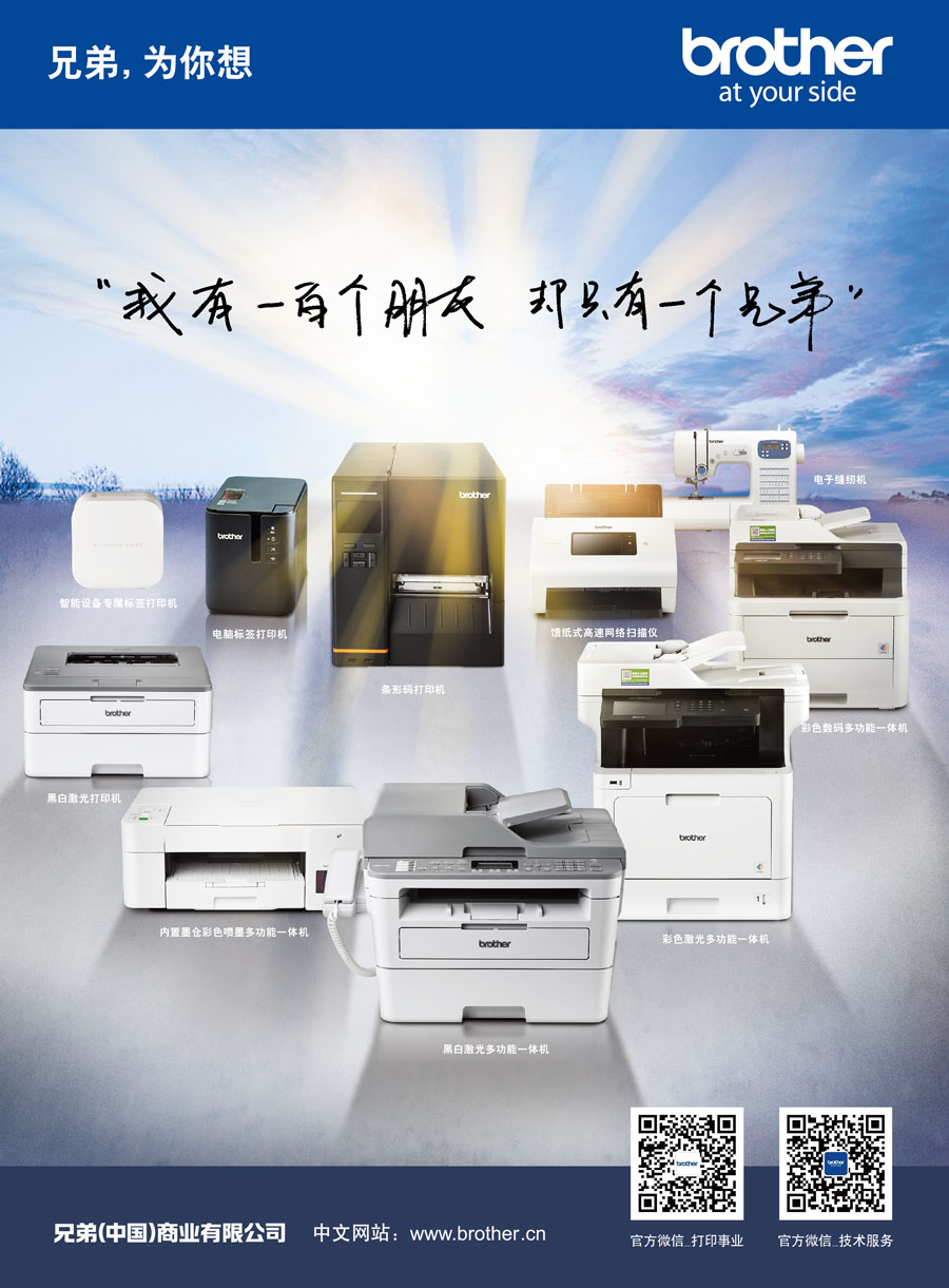 Brother作為擁有110多年歷史的國(guó)際化品牌,目前已在全球40個(gè)以上的國(guó)家和地區(qū)擁有研究開發(fā)基地、生產(chǎn)基地以及銷售公司。作為Brother集團(tuán)在中國(guó)的產(chǎn)品銷售與服務(wù)的外商獨(dú)資企業(yè),兄弟(中國(guó))充分利用集團(tuán)的資源優(yōu)勢(shì),秉承“At your side.”的企業(yè)文化理念,遵循顧客第一的宗旨,傾聽顧客的呼聲,為中國(guó)消費(fèi)者提供更多具有高附加值的產(chǎn)品和服務(wù)。兄弟(中國(guó))的事業(yè)領(lǐng)域包括以打印機(jī)、多功能一體機(jī)、傳真機(jī)、標(biāo)簽打印機(jī)、掃描儀等產(chǎn)品為代表的打印及解決方案事業(yè);以家用縫紉機(jī)、商用繡花機(jī)、電腦花樣裁切機(jī)為中心的家用機(jī)器事業(yè)。