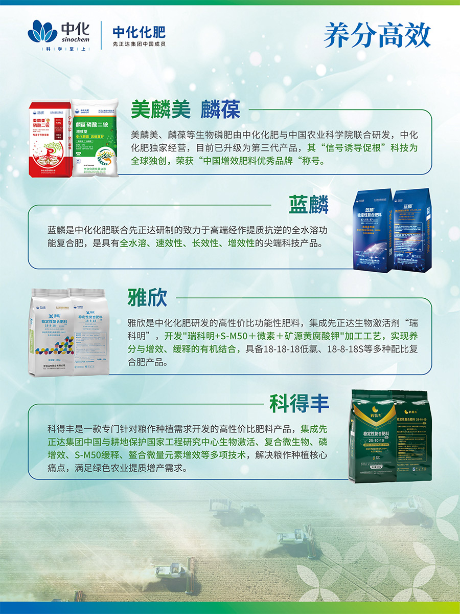 美麟美、麟葆等生物磷肥由中化化肥與中國農(nóng)業(yè)科學(xué)院聯(lián)合研發(fā),中化化肥獨家經(jīng)營,目前已升級為第三代產(chǎn)品,其“信號誘導(dǎo)促根”科技為全球獨創(chuàng),榮獲“中國增效肥料優(yōu)秀品牌“稱號藍(lán)麟是中化化肥聯(lián)合先正達(dá)研制的致力于高端經(jīng)作提質(zhì)抗逆的全水溶功能復(fù)合肥,是具有全水溶、速效性、長效性、增效性的尖端科技產(chǎn)品。
