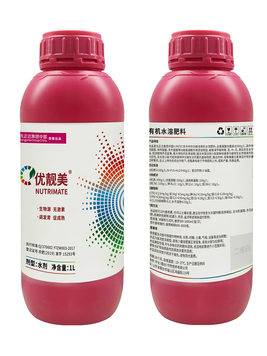 優(yōu)靚美是先正達(dá)集團中國X-PATec系列中的功能性有機水溶肥料。總氨基酸含量高達(dá)500g/L,能夠調(diào)節(jié)植物根、莖、葉、花、果實的生長平衡,促進(jìn)植物開花座果、膨大轉(zhuǎn)色的生育進(jìn)程;提高作物抗逆性,滿足作物多重營養(yǎng)需求。有助于作物提前上市,提高產(chǎn)量,改善品質(zhì)。