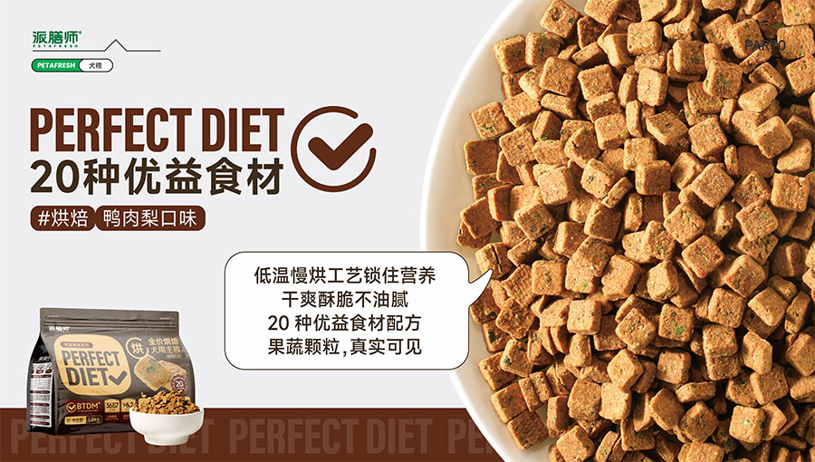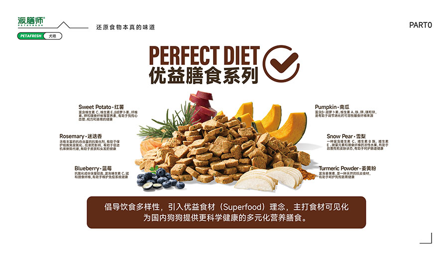 目前派膳師已擁有鮮食、零食、主糧等產(chǎn)品線,主打中高端主糧品類。全新(Perfect Diet)優(yōu)益膳食犬糧系列,倡導(dǎo)飲食多樣性,引入優(yōu)益食材(Superfood)理念,主打食材可見化,為國(guó)內(nèi)狗狗提供更科學(xué)健康的多元化營(yíng)養(yǎng)膳食。