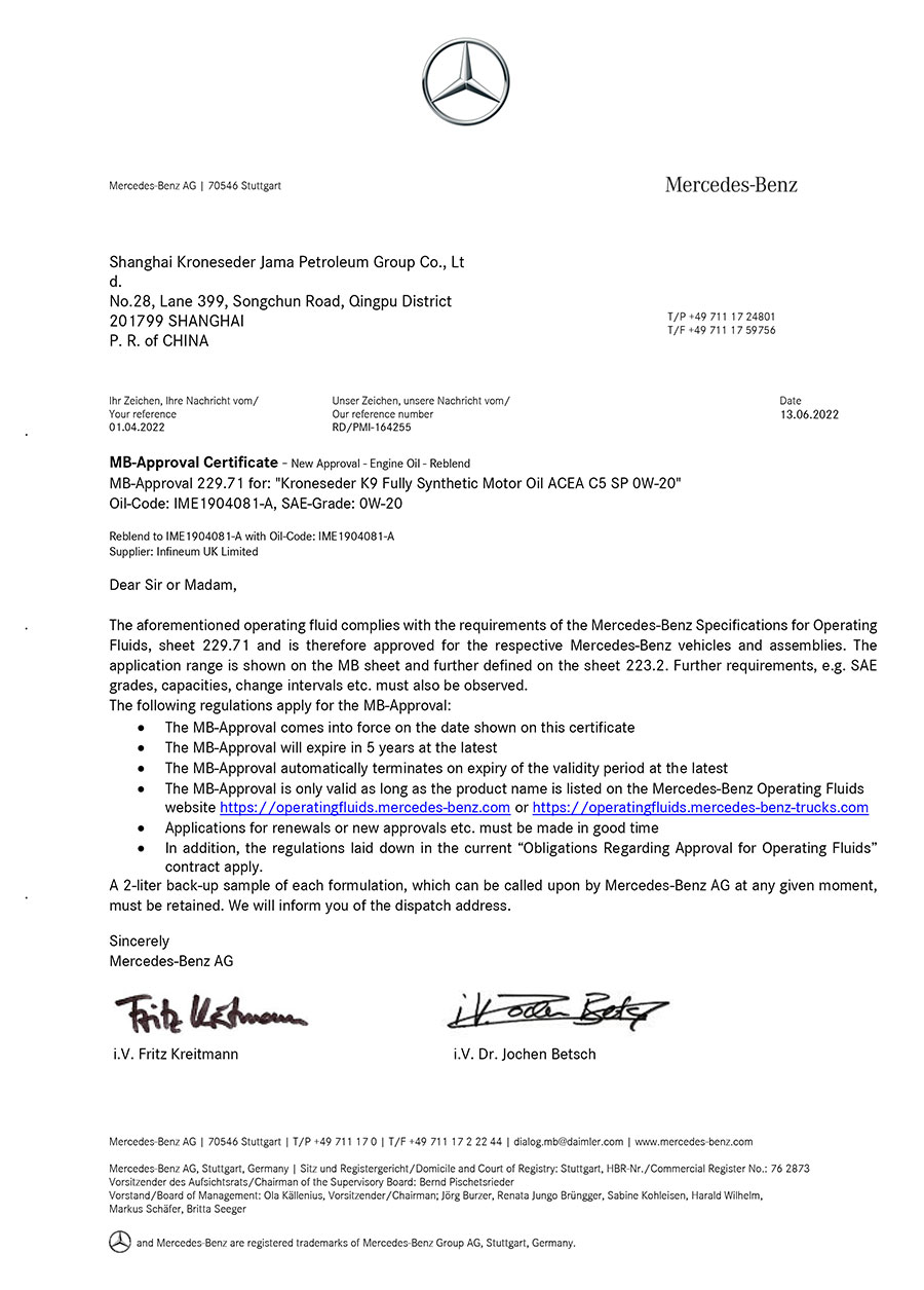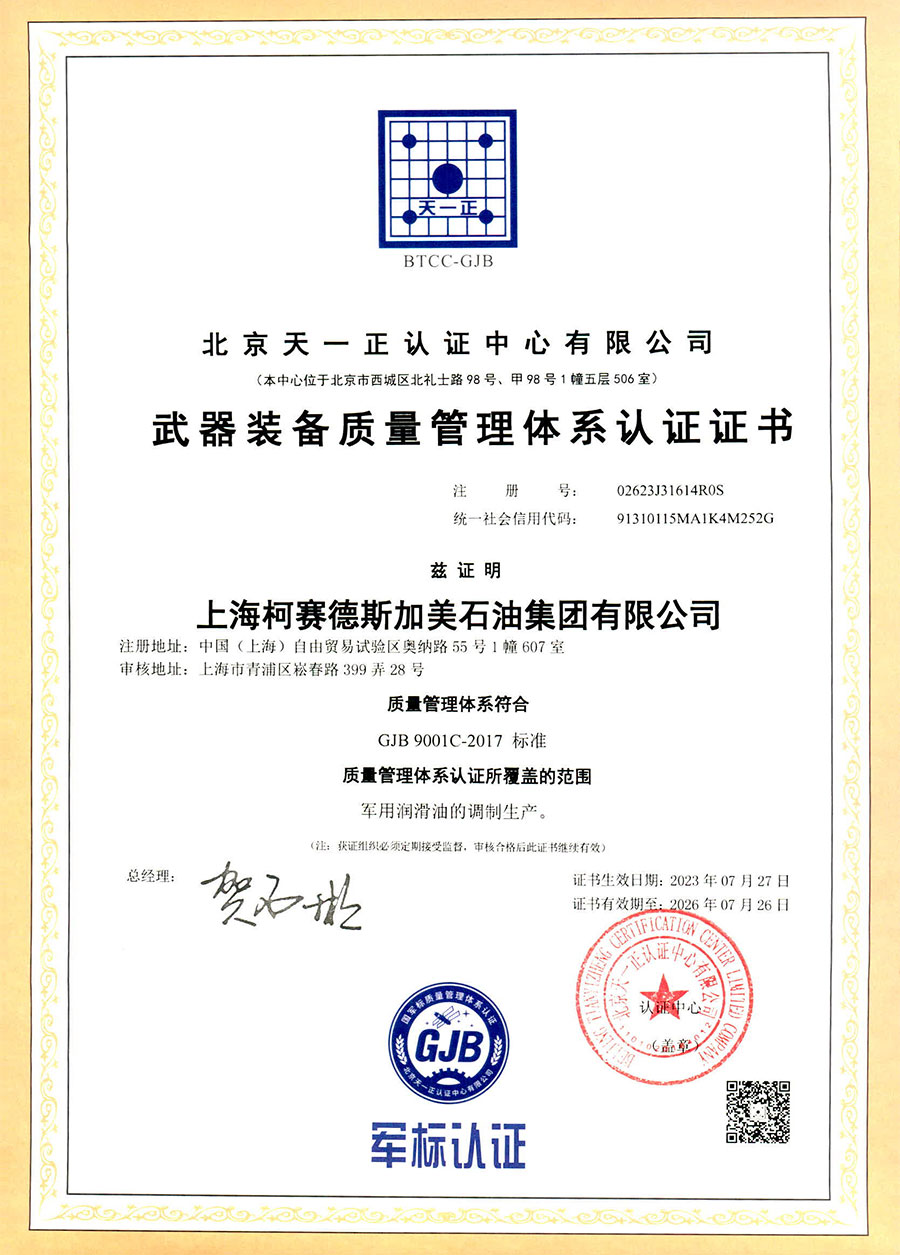柯賽德斯集團(tuán)公司統(tǒng)一遵循嚴(yán)格的質(zhì)量保證體系,先后通過了武器裝備質(zhì)量管理體系認(rèn)證GJB9001C-2017、ISO/TS16949、IS09001質(zhì)量體系認(rèn)證、1S014001環(huán)境體系認(rèn)證及ISO45001:2018職業(yè)健康安全管理體系認(rèn)證。隨著業(yè)務(wù)領(lǐng)域的不斷擴(kuò)展,目前集團(tuán)公司先后與多家世界能源、化工方面的巨頭建立了產(chǎn)品服務(wù)、供應(yīng)保障、技術(shù)合作、技術(shù)特別支持單位等方面的戰(zhàn)略合作關(guān)系。今天,柯賽德斯集團(tuán)旗下管理著三大潤滑油品牌,實現(xiàn)了經(jīng)營上的多元化戰(zhàn)略格局。