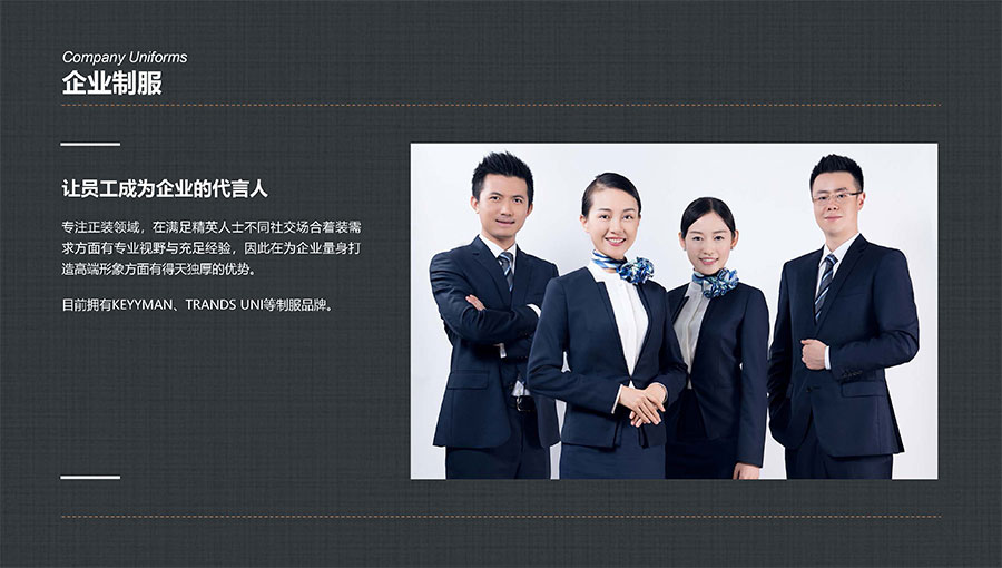凱門品牌(KEYYMEN):高級職業(yè)裝品牌,企業(yè)形象定制專家。以精湛工藝及最優(yōu)性價比打造高品質、個性時尚的企業(yè)形象,專屬于那些為理想、為事業(yè)打拼,并在成功過程中享受生活的職場團隊及精英人士。