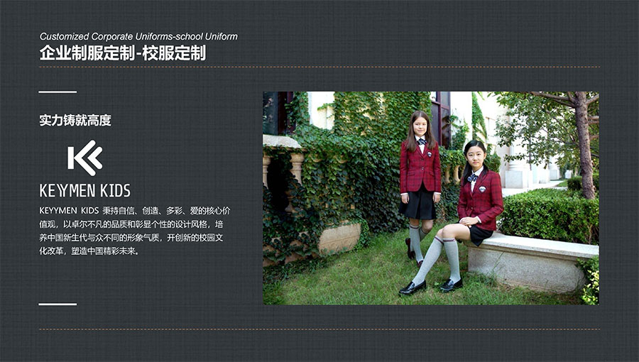凱門學生裝(KEYYMEN KIDS)秉持自信、創(chuàng)造、多彩、愛的核心價值觀,堅持“領先一步,步步領先”的品牌理念,致力于打造最具影響力的學生裝品牌,為中國青少年形象代言,以卓爾不凡的品質和彰顯個性的設計風格,培養(yǎng)中國青少年與眾不同的形象氣質。