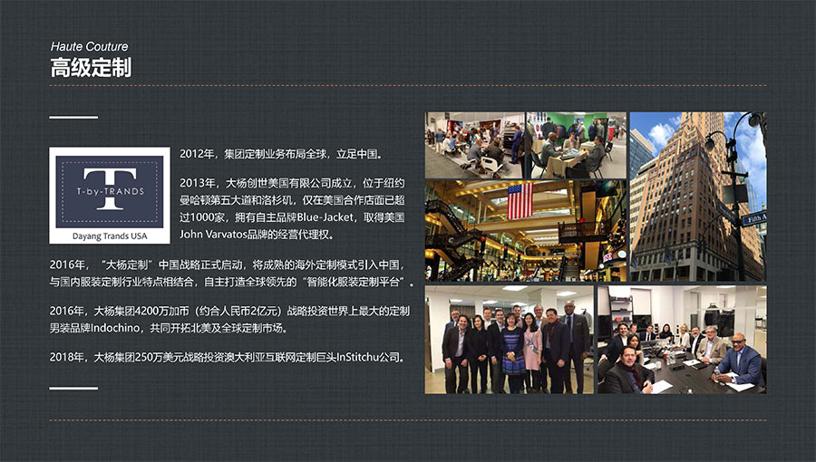 目前,大楊集團全球營銷網(wǎng)絡已遍布美國、加拿大、荷蘭、英國、澳大利亞及日本等27個國家和地區(qū),開設單裁合作店面上千家,與加拿大互聯(lián)網(wǎng)定制巨頭Indochino公司、澳大利亞知名男裝定制企業(yè)Institchu公司、美國服裝巨頭TBI公司簽署戰(zhàn)略合作協(xié)議,年定制產品數(shù)量已突破200萬件/套,具備西裝、襯衫、休閑裝以及大衣、風衣等全品類定制生產能力。