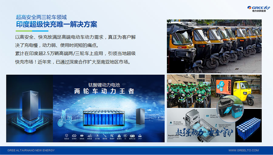 以完善的研發(fā)體系,格力鈦加快技術(shù)創(chuàng)新與產(chǎn)業(yè)升級(jí)的步伐。格力鈦研發(fā)的格力鈦電池安全性長(zhǎng)期領(lǐng)跑行業(yè),憑借具有高安全、大倍率、快充放、耐寬溫、長(zhǎng)壽命等特性,被選為“國(guó)家制造業(yè)單項(xiàng)冠軍產(chǎn)品”,廣泛應(yīng)用于新能源汽車以及工商業(yè)園區(qū)、通訊基站、電網(wǎng)調(diào)頻、軌道交通、風(fēng)光消納、船舶岸電、家庭住宅、軍事科研等儲(chǔ)能領(lǐng)域,具有廣闊的市場(chǎng)前景和應(yīng)用價(jià)值。目前,格力鈦儲(chǔ)能產(chǎn)品已在丹麥、瑞士、芬蘭等全球30多個(gè)國(guó)家和地區(qū)使用,新能源汽車產(chǎn)品在北京、杭州、武漢、成都、青島、哈爾濱、包頭、??诘热?40多座城市運(yùn)營(yíng),12年全球零電池事故安全運(yùn)行。