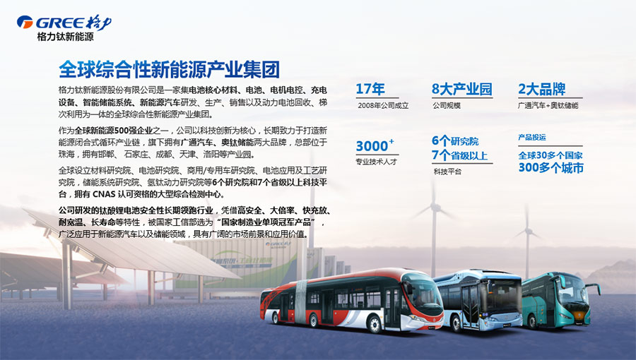 格力鈦新能源股份有限公司是一家集鋰電池核心材料、電池、電機(jī)電控、充電設(shè)備、智能儲(chǔ)能系統(tǒng)、新能源汽車研發(fā)、生產(chǎn)、銷售以及動(dòng)力電池回收梯次利用為一體的全球綜合性新能源產(chǎn)業(yè)集團(tuán)。格力鈦以科技創(chuàng)新為核心,打造新能源閉合式循環(huán)產(chǎn)業(yè)鏈,旗下?lián)碛袕V通汽車、奧鈦儲(chǔ)能兩大品牌,總部位于珠海,擁有邯鄲、石家莊、成都、天津、洛陽(yáng)、南京等產(chǎn)業(yè)園。