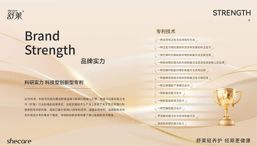 舒萊作為抑菌衛(wèi)生巾行業(yè)標(biāo)準(zhǔn)起草單位,目前累計(jì)擁有61項(xiàng)國家專利(含發(fā)明專利、實(shí)用新型及外觀專利),也在抗菌技術(shù)與產(chǎn)業(yè)上發(fā)表了關(guān)于熒光劑增白劑使用的學(xué)術(shù)研究等,構(gòu)建了難以復(fù)制的技術(shù)壁壘。