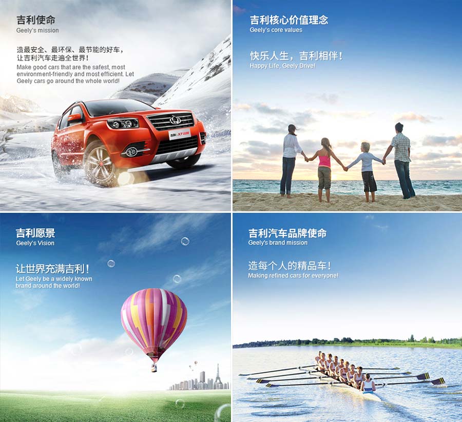 本著“總體跟隨、局部超越、重點(diǎn)突破、招賢納士、合縱連橫、后來居上”的發(fā)展戰(zhàn)略和“快樂人生,吉利相伴”的核心價(jià)值理念,浙江吉利控股集團(tuán)將堅(jiān)持走科技創(chuàng)新的道路,發(fā)揮團(tuán)隊(duì)智慧,打造具有國際影響力和全球競爭力、受人尊敬的世界500強(qiáng)汽車企業(yè)集團(tuán),為中國汽車工業(yè)的崛起,為實(shí)現(xiàn)“讓吉利汽車走遍全世界”的美麗追求而奮斗!