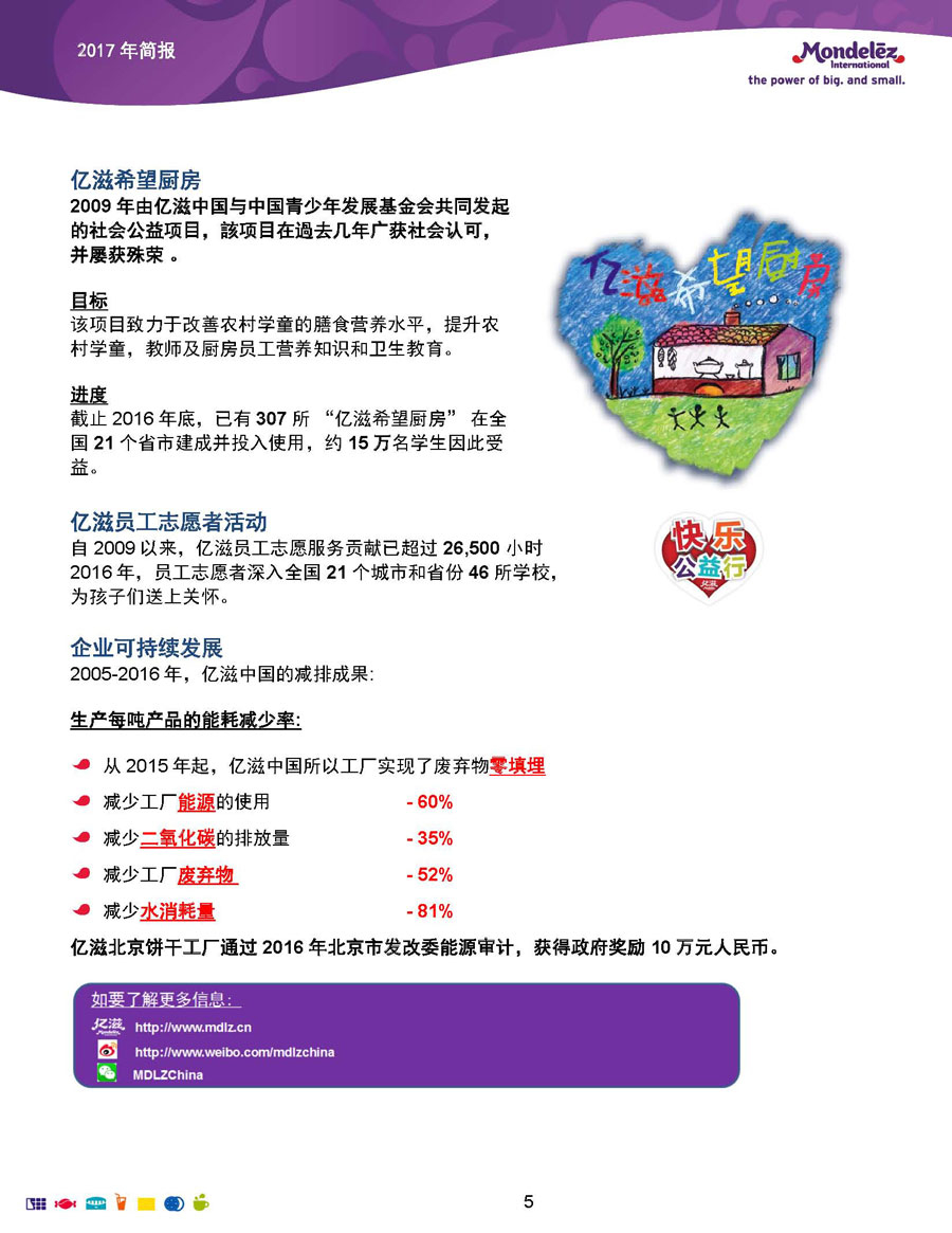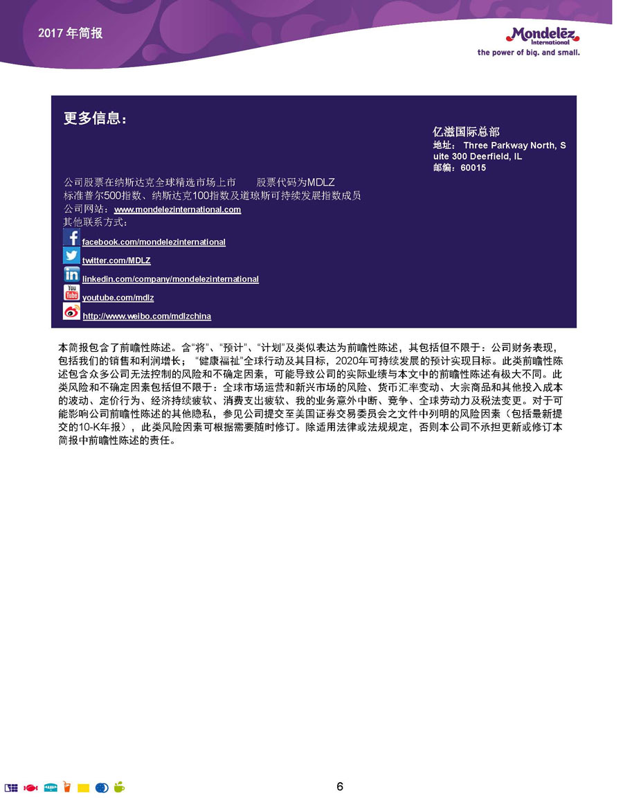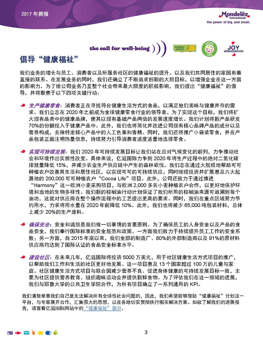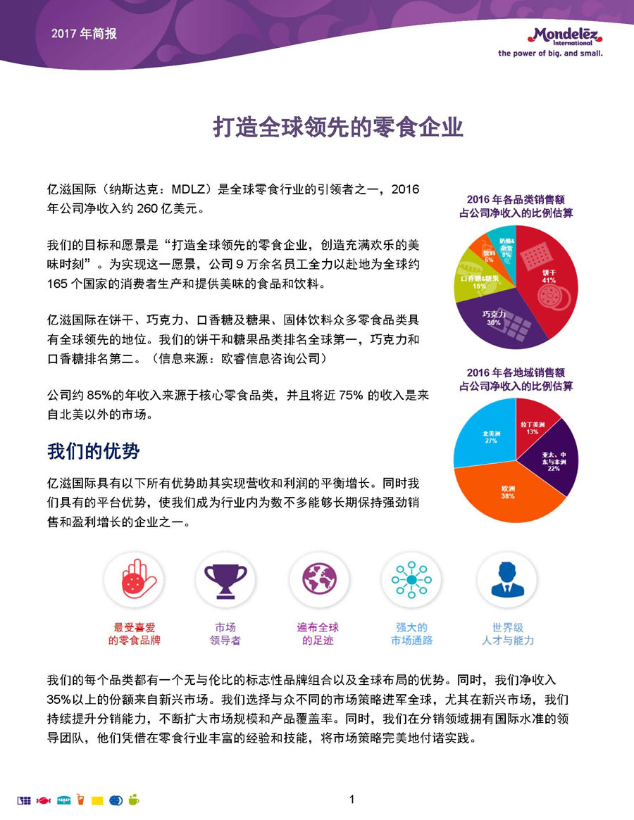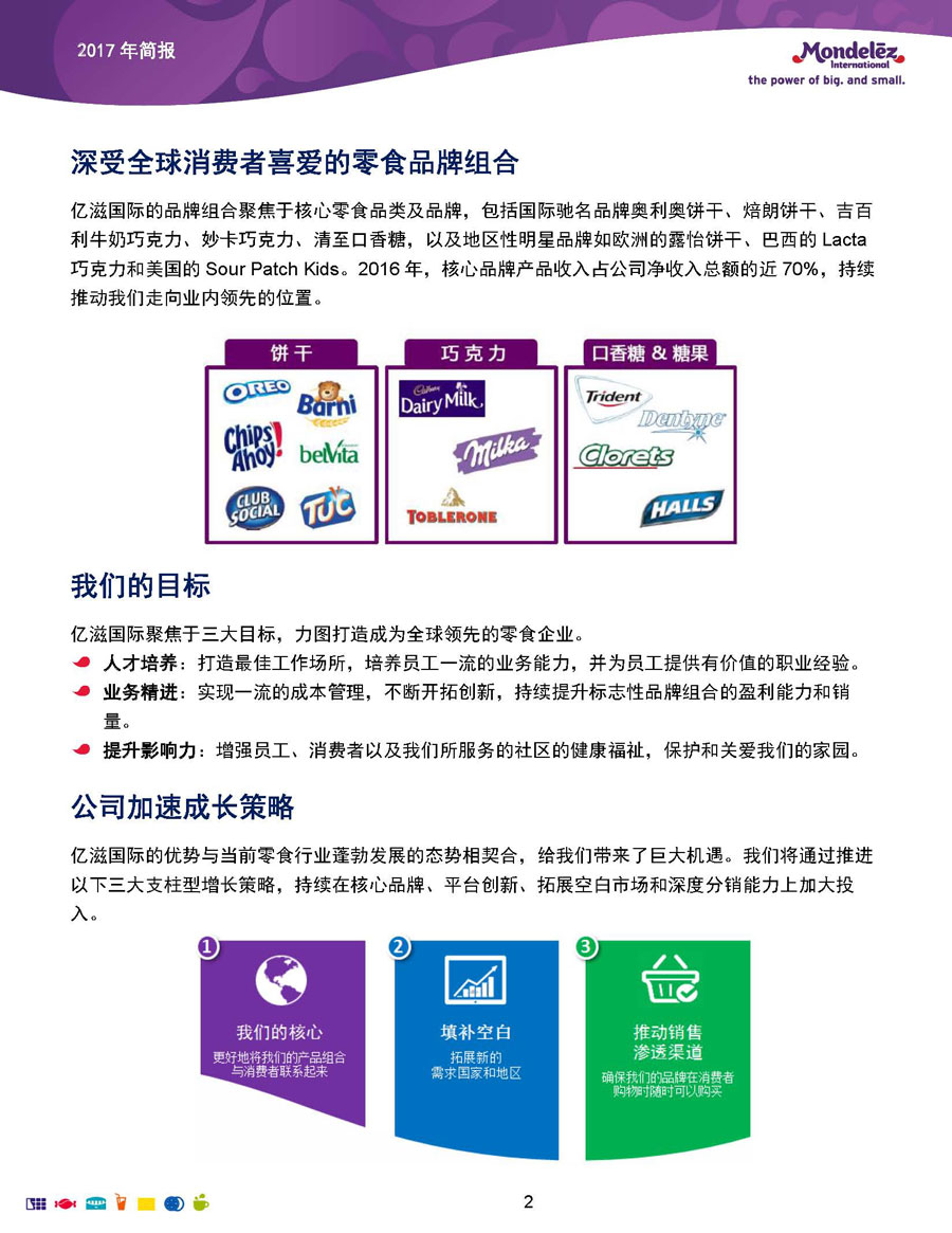 我們的目標和愿景是:打造全球領(lǐng)先的零食企業(yè),創(chuàng)造充滿歡樂的美味時刻。為實現(xiàn)這一愿景,公司9萬余名員工全力以赴地為全球約165個國家的消費者生產(chǎn)和提供美味的食品和飲料。