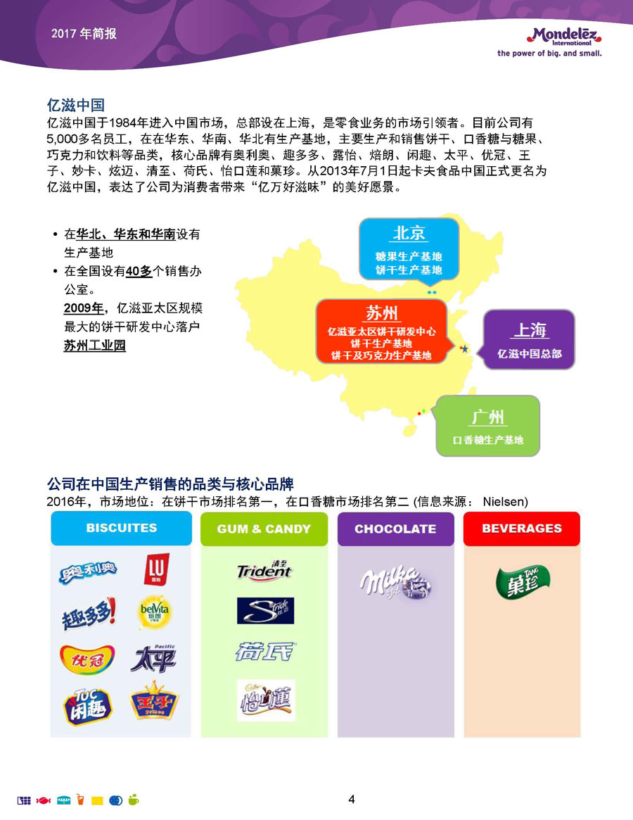 億滋中國于1984年進入中國市場,總部設(shè)在上海,是零食業(yè)務(wù)的市場引領(lǐng)者。目前公司有5000多名員工,在華東、華南、華北有生產(chǎn)基地,主要生產(chǎn)和銷售餅干、口香糖與糖果、巧克力和飲料等品類,核心品牌有奧利奧、趣多多、露怡、焙朗、閑趣、太平、優(yōu)冠、王子、妙卡、炫邁、清至、荷氏、怡口蓮和菓珍。從2013年7月1日起卡夫食品中國正式更名為億滋中國,表達了公司為消費者帶來“億萬好滋味”的美好愿景。