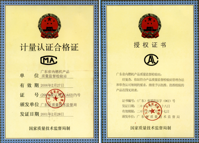 廣東省內(nèi)燃機(jī)產(chǎn)品質(zhì)量監(jiān)督檢驗(yàn)站是1987年根據(jù)廣東省標(biāo)準(zhǔn)計(jì)量管理局(現(xiàn)省質(zhì)量技術(shù)監(jiān)督局)和廣東省機(jī)械工業(yè)廳(現(xiàn)廣東省機(jī)械工業(yè)集團(tuán)公司)聯(lián)合發(fā)(1987)376號(hào)文批準(zhǔn)籌建的。1989年經(jīng)審查認(rèn)證,獲得了省科委頒發(fā)的“科技成果檢測(cè)檢定資格證書(shū)”。1990年6月首次通過(guò)了廣東省質(zhì)量技術(shù)監(jiān)督局和廣東省機(jī)械工業(yè)廳組織的計(jì)量認(rèn)證和審查認(rèn)可,獲得了省質(zhì)量技術(shù)監(jiān)督頒發(fā)的“計(jì)量認(rèn)證合格證”、“計(jì)量認(rèn)證合格證單位”等證書(shū)。1995年和2000年通過(guò)了省質(zhì)量技術(shù)監(jiān)督的審查認(rèn)可復(fù)查,并獲得“計(jì)量認(rèn)證資格證”和依法授權(quán)的產(chǎn)品質(zhì)量監(jiān)督檢驗(yàn)證書(shū)。