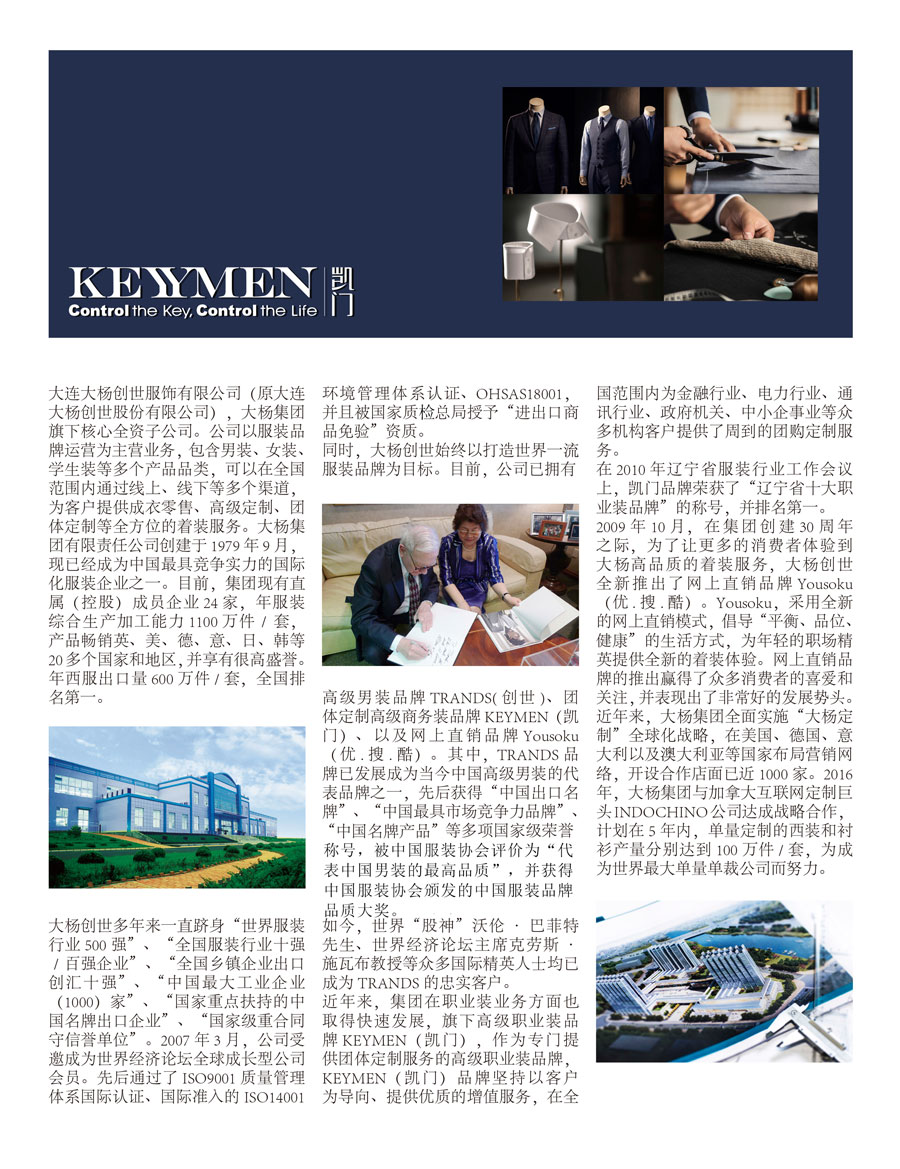 主要產(chǎn)品:KEYYMEN(凱門)高端男裝、新銳時尚服裝、學生裝等系列服裝服飾