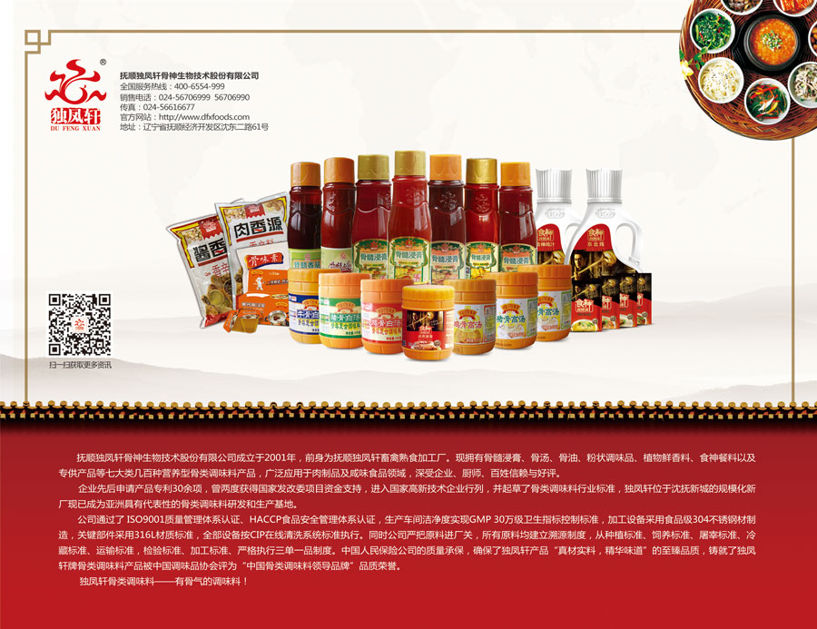 主要產(chǎn)品:獨(dú)鳳軒骨髓浸膏、骨湯、骨油、粉狀調(diào)味品、植物香辛料