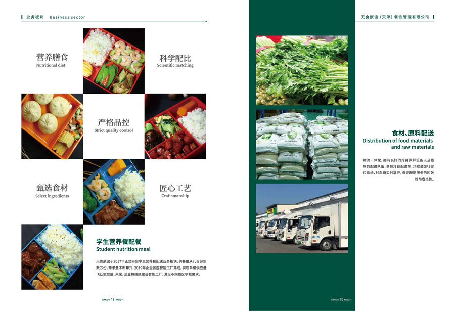 天食康誼(天津)餐飲管理有限公司隸屬于天津食品集團(tuán),公司總部坐落于天祥工業(yè)園區(qū),總占地面積15000平方米,主營業(yè)務(wù)涵蓋食材采購運輸、學(xué)生營養(yǎng)餐配餐、駐地餐廳服務(wù)、美食廣場運營。依托母公司強(qiáng)大食品產(chǎn)業(yè)優(yōu)勢,與眾多知名品牌供應(yīng)商形成長期合作關(guān)系,整合產(chǎn)業(yè)鏈上下游資源,打造“從田間到餐桌” 鏈條,成為行業(yè)內(nèi)極具優(yōu)勢的團(tuán)膳企業(yè)。目前服務(wù)的客戶有總醫(yī)院、民航大學(xué)、天地偉業(yè)、農(nóng)行、鞍山道小學(xué)等,涵蓋各行業(yè)企事業(yè)單位、大中小學(xué)。