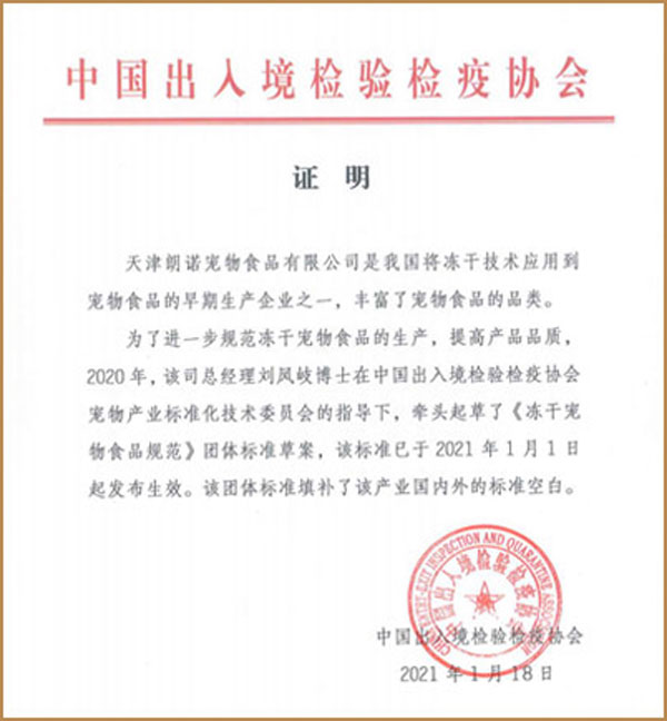 不僅在產(chǎn)品本身實現(xiàn)突破,2021年1月1日,在中國出入境檢驗檢疫協(xié)會寵物產(chǎn)業(yè)標(biāo)準(zhǔn)化技術(shù)委員會指導(dǎo)下,由朗諾董事長劉鳳岐博士領(lǐng)銜起草的《凍干寵物食品規(guī)范》正式頒布并實施。身為十三年出口企業(yè),朗諾相信,通過不斷完善的行業(yè)標(biāo)準(zhǔn),越來越多真正優(yōu)秀的國內(nèi)品牌將更易獲得認(rèn)同,中國寵物食品行業(yè)也將勢如破竹、蒸蒸日上。期待不久將來中國民族企業(yè)將全線崛起,以嶄新的面貌立于全球市場的潮流之中。