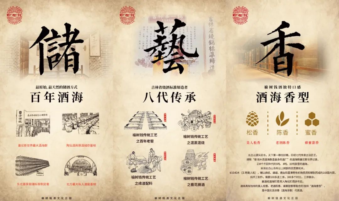 好的品牌需要好的品質(zhì)作為支撐。長(zhǎng)白山源頭好水,天下第一糧倉(cāng)好糧,歷經(jīng)八代傳承古法匠藝,234個(gè)不同年代的酒海,采用長(zhǎng)白山百年以上樹齡的優(yōu)質(zhì)黃松木,長(zhǎng)白松木(又稱美人松),輔以麻紙、蜂蠟、鹿血和蛋清等有機(jī)物質(zhì)調(diào)和糊制而成的168層內(nèi)膽,純手工制作,需要100多道工序,300多個(gè)時(shí)日,工序繁雜,基酒經(jīng)酒海貯藏再入陶壇貯藏多年后,酒體則具有獨(dú)特的美人松香、老酒陳香、蜂蜜甜香,是榆樹錢酒業(yè)獨(dú)特的“酒海香型”。