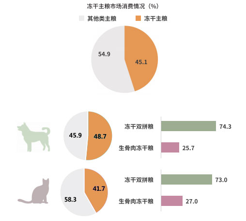 據(jù)朗諾與派讀調(diào)研數(shù)據(jù)顯示,目前,寵物凍干類產(chǎn)品在主糧、零食市場的偏好度均持續(xù)提升,凍干主糧在犬、貓糧中的滲透率分別為 48.7%、41.7%,凍干零食的滲透率則為 45.4%。其中凍干雙拼糧仍是最受寵物主歡迎的主糧產(chǎn)品,貓凍干主糧及零食市場仍有較大的增長空間與市場潛力。