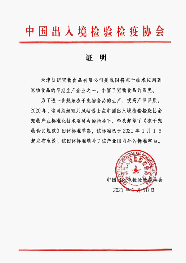 朗諾作為國內(nèi)率先將國際前沿凍干技術應用于寵物食品研發(fā)及生產(chǎn)的企業(yè),始終以推動凍干寵物食品行業(yè)規(guī)范、引領產(chǎn)業(yè)升級為己任。早在2021年1月在寵工委的指導下,由朗諾領銜起草制定《凍干寵物食品規(guī)范》正式頒布實施,為中國凍干寵物食品樹立細分行業(yè)標準。