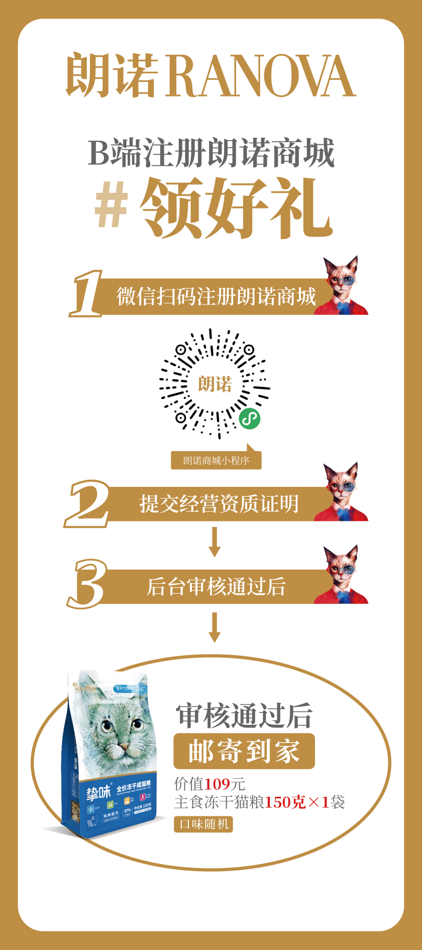 朗諾誠邀各位B端客戶,微信掃碼注冊“朗諾商城”或者微信搜索“朗諾商城”,按步驟上傳資質(zhì),審核通過,即可獲得朗諾準備的精品好禮一份:朗諾主食凍干150克(口味隨機)一袋,直接包郵到家。同時我們還為“朗諾商城”的各位客戶,定制超值價格政策,進貨不費力,敬請期待。