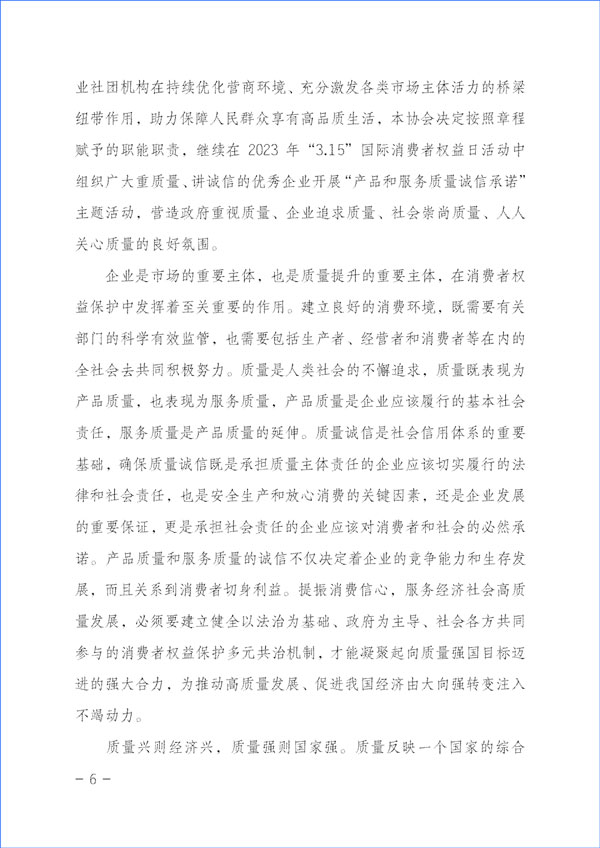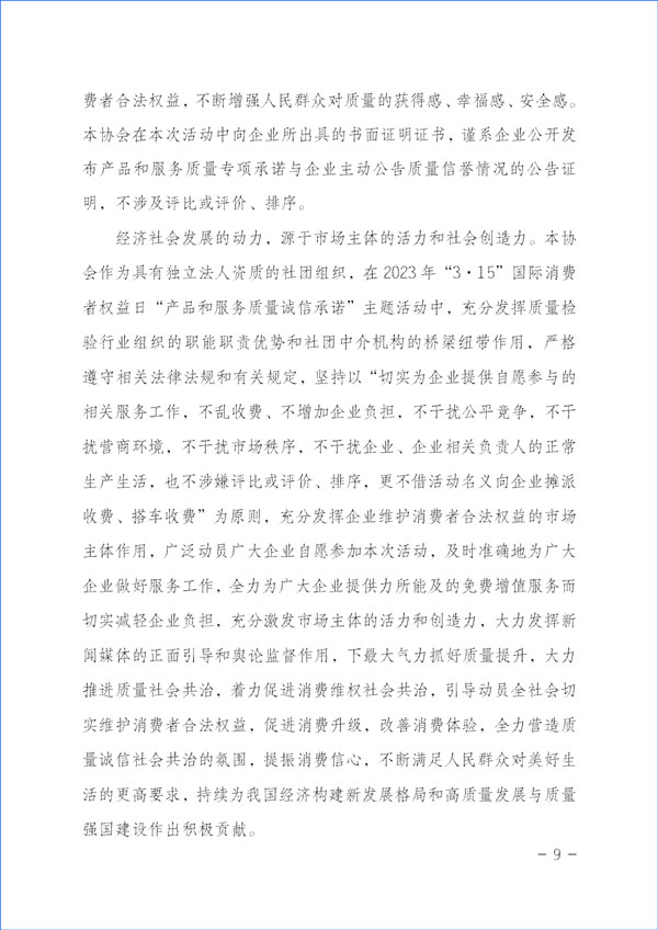 經(jīng)濟(jì)社會(huì)發(fā)展的動(dòng)力,源于市場(chǎng)主體的活力和社會(huì)創(chuàng)造力。本協(xié)會(huì)作為具有獨(dú)立法人資質(zhì)的社團(tuán)組織,在2023年“3·15”國(guó)際消費(fèi)者權(quán)益日“產(chǎn)品和服務(wù)質(zhì)量誠(chéng)信承諾”主題活動(dòng)中,充分發(fā)揮質(zhì)量檢驗(yàn)行業(yè)組織的職能職責(zé)優(yōu)勢(shì)和社團(tuán)中介機(jī)構(gòu)的橋梁紐帶作用,嚴(yán)格遵守相關(guān)法律法規(guī)和有關(guān)規(guī)定,堅(jiān)持以“切實(shí)為企業(yè)提供自愿參與的相關(guān)服務(wù)工作,不亂收費(fèi)、不增加企業(yè)負(fù)擔(dān),不干擾公平競(jìng)爭(zhēng),不干擾營(yíng)商環(huán)境,不干擾市場(chǎng)秩序,不干擾企業(yè)、企業(yè)相關(guān)負(fù)責(zé)人的正常生產(chǎn)生活,也不涉嫌評(píng)比或評(píng)價(jià)、排序,更不借活動(dòng)名義向企業(yè)攤派收費(fèi)、搭車(chē)收費(fèi)”為原則,充分發(fā)揮企業(yè)維護(hù)消費(fèi)者合法權(quán)益的市場(chǎng)主體作用,廣泛動(dòng)員廣大企業(yè)自愿參加本次活動(dòng),及時(shí)準(zhǔn)確地為廣大企業(yè)做好服務(wù)工作,全力為廣大企業(yè)提供力所能及的免費(fèi)增值服務(wù)而切實(shí)減輕企業(yè)負(fù)擔(dān),充分激發(fā)市場(chǎng)主體的活力和創(chuàng)造力,大力發(fā)揮新聞媒體的正面引導(dǎo)和輿論監(jiān)督作用,下最大氣力抓好質(zhì)量提升,大力推進(jìn)質(zhì)量社會(huì)共治,著力促進(jìn)消費(fèi)維權(quán)社會(huì)共治,引導(dǎo)動(dòng)員全社會(huì)切實(shí)維護(hù)消費(fèi)者合法權(quán)益,促進(jìn)消費(fèi)升級(jí),改善消費(fèi)體驗(yàn),全力營(yíng)造質(zhì)量誠(chéng)信社會(huì)共治的氛圍,提振消費(fèi)信心,不斷滿(mǎn)足人民群眾對(duì)美好生活的更高要求,持續(xù)為我國(guó)經(jīng)濟(jì)構(gòu)建新發(fā)展格局和高質(zhì)量發(fā)展與質(zhì)量強(qiáng)國(guó)建設(shè)作出積極貢獻(xiàn)。