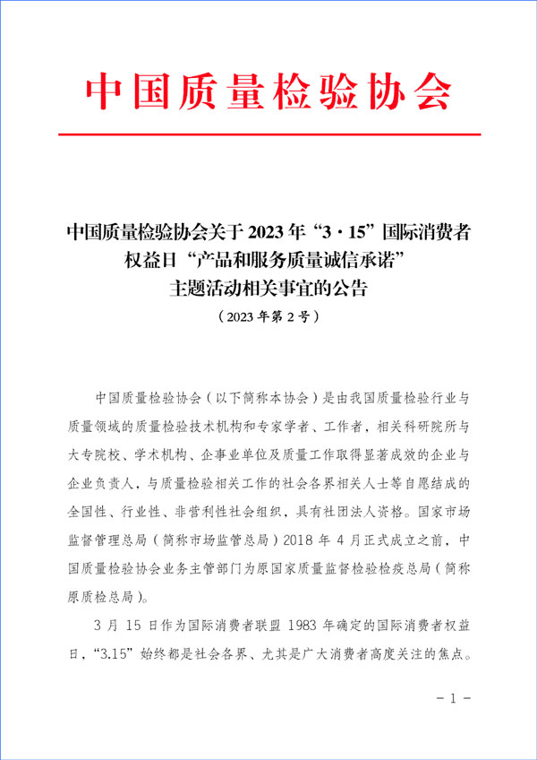 中國(guó)質(zhì)量檢驗(yàn)協(xié)會(huì)關(guān)于組織開(kāi)展2023年“3·15”活動(dòng)的公告(2023年第2號(hào))