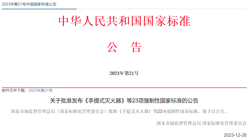 近日,2023年第21號國家標(biāo)準(zhǔn)公告發(fā)布,國家市場監(jiān)督管理總局(國家標(biāo)準(zhǔn)化管理委員會)批準(zhǔn)發(fā)布《手提式滅火器》等23項(xiàng)強(qiáng)制性國家標(biāo)準(zhǔn),詳情如下: