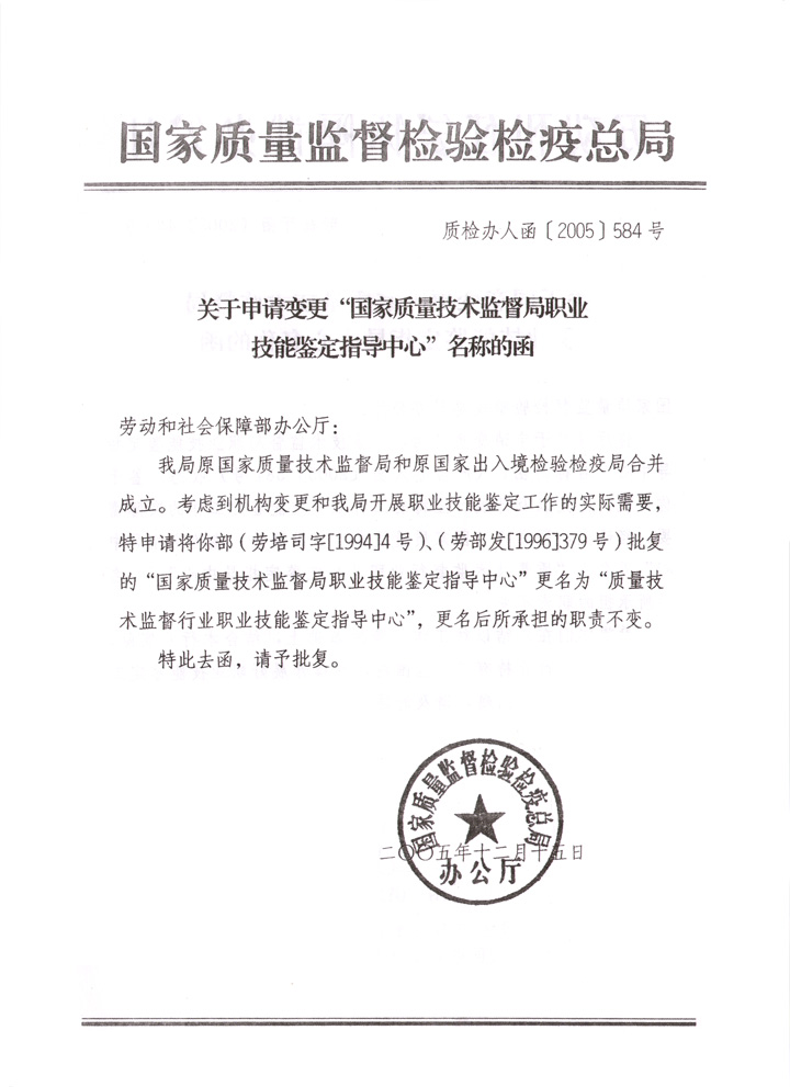 關(guān)于申請(qǐng)變更“國(guó)家質(zhì)量技術(shù)監(jiān)督局職業(yè)技能鑒定指導(dǎo)中心”名稱的函