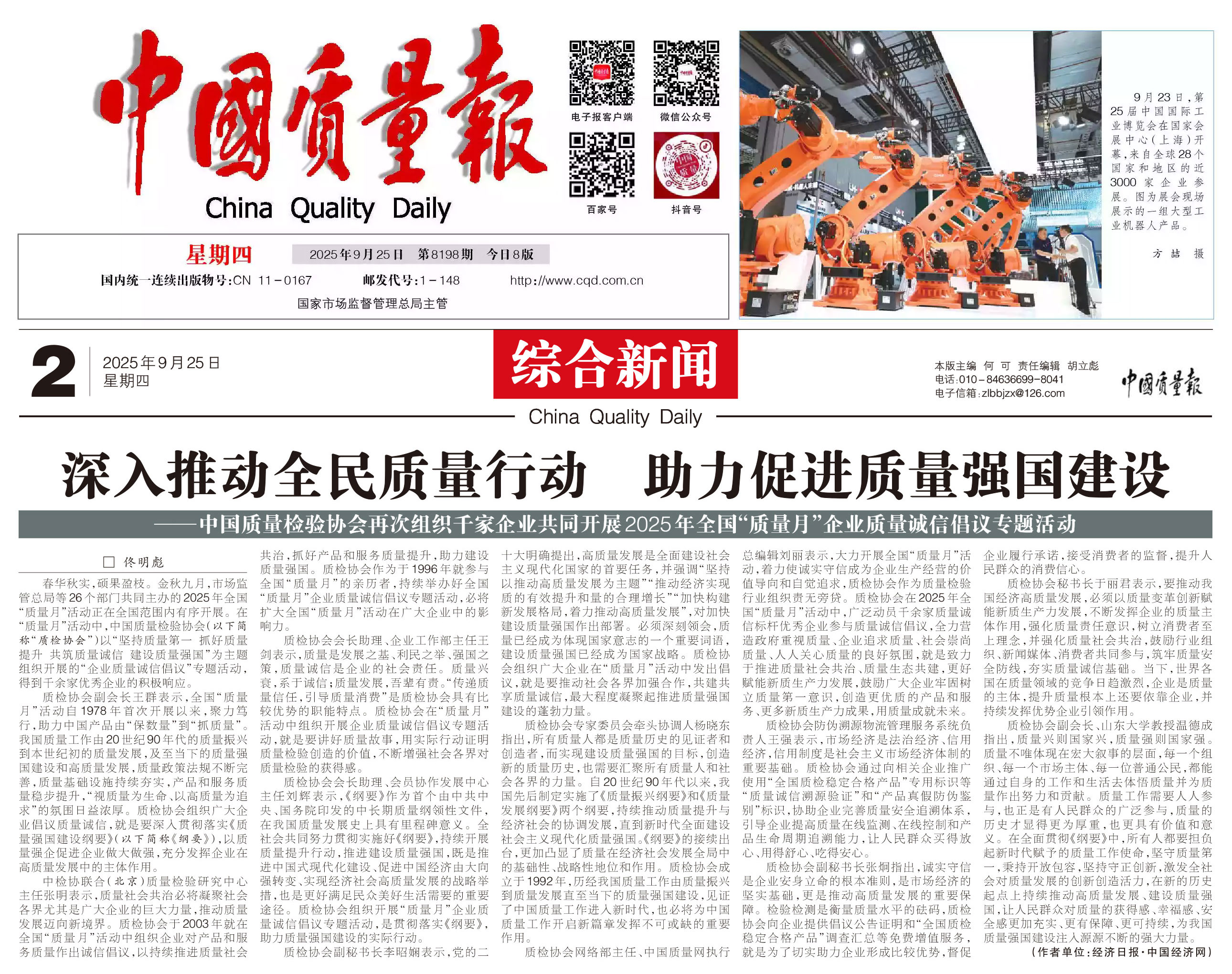 - 《中國(guó)質(zhì)量報(bào)》(2025年9月25日刊)發(fā)布:深入推動(dòng)全民質(zhì)量行動(dòng) 助力促進(jìn)質(zhì)量強(qiáng)國(guó)建設(shè)——中國(guó)質(zhì)量檢驗(yàn)協(xié)會(huì)再次組織千家企業(yè)共同開(kāi)展2025年全國(guó)“質(zhì)量月”企業(yè)質(zhì)量誠(chéng)信倡議專題活動(dòng)