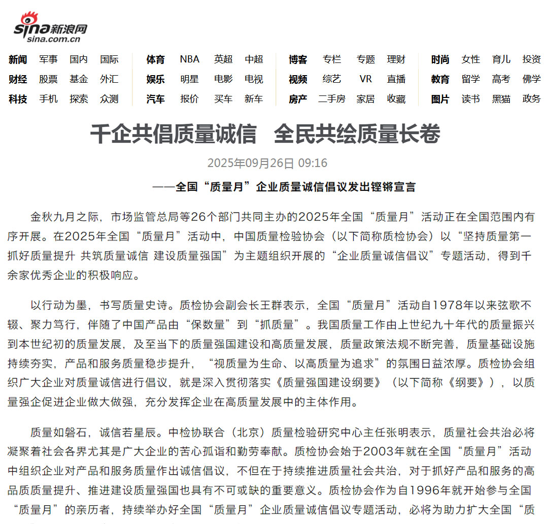 - 新浪網(wǎng)報(bào)道——千家企業(yè)發(fā)出倡議:視質(zhì)量為生命 以高質(zhì)量為追求——中國(guó)質(zhì)量檢驗(yàn)協(xié)會(huì)組織開(kāi)展2025年全國(guó)“質(zhì)量月”企業(yè)質(zhì)量誠(chéng)信倡議活動(dòng)