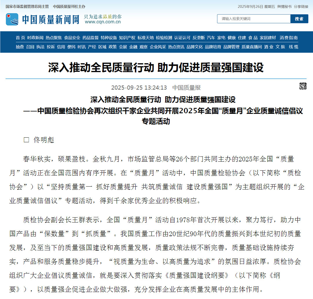 - 新華網(wǎng)報(bào)道——千家企業(yè)發(fā)出倡議:視質(zhì)量為生命 以高質(zhì)量為追求——中國(guó)質(zhì)量檢驗(yàn)協(xié)會(huì)組織開(kāi)展2025年全國(guó)“質(zhì)量月”企業(yè)質(zhì)量誠(chéng)信倡議活動(dòng)
