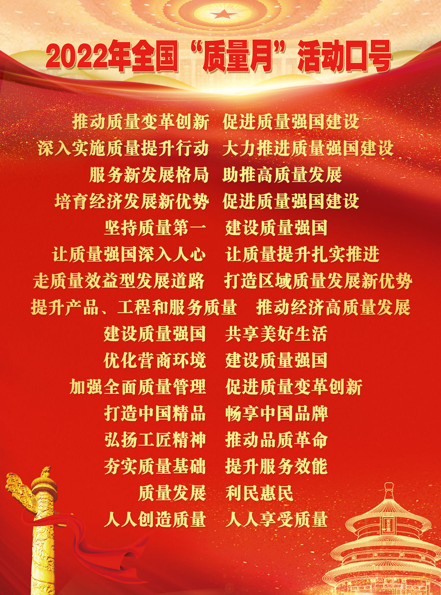 為深入貫徹習(xí)近平新時(shí)代中國特色社會(huì)主義思想,全面落實(shí)黨的十九大和十九屆歷次全會(huì)精神,立足新發(fā)展階段,完整、準(zhǔn)確、全面貫徹新發(fā)展理念,構(gòu)建新發(fā)展格局,樹立質(zhì)量第一的強(qiáng)烈意識(shí),大力提升各行業(yè)質(zhì)量水平,推動(dòng)經(jīng)濟(jì)加快發(fā)展,促進(jìn)質(zhì)量強(qiáng)國建設(shè),以實(shí)際行動(dòng)迎接黨的二十大勝利召開,市場(chǎng)監(jiān)管總局等21個(gè)部門定于2022年9月聯(lián)合開展以“推動(dòng)質(zhì)量變革創(chuàng)新 促進(jìn)質(zhì)量強(qiáng)國建設(shè)”為主題的2022年全國“質(zhì)量月”活動(dòng)。